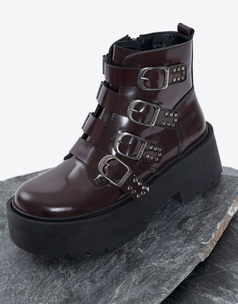 Borcego de mujer en cuero con plataforma y caña media. Base inyectada. Detalle de hebillas regulables, remaches y cierre en lado interno. . Este ítem pertenece a la categoría Outlet.